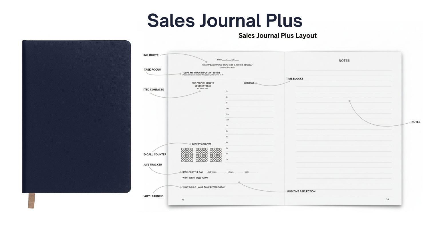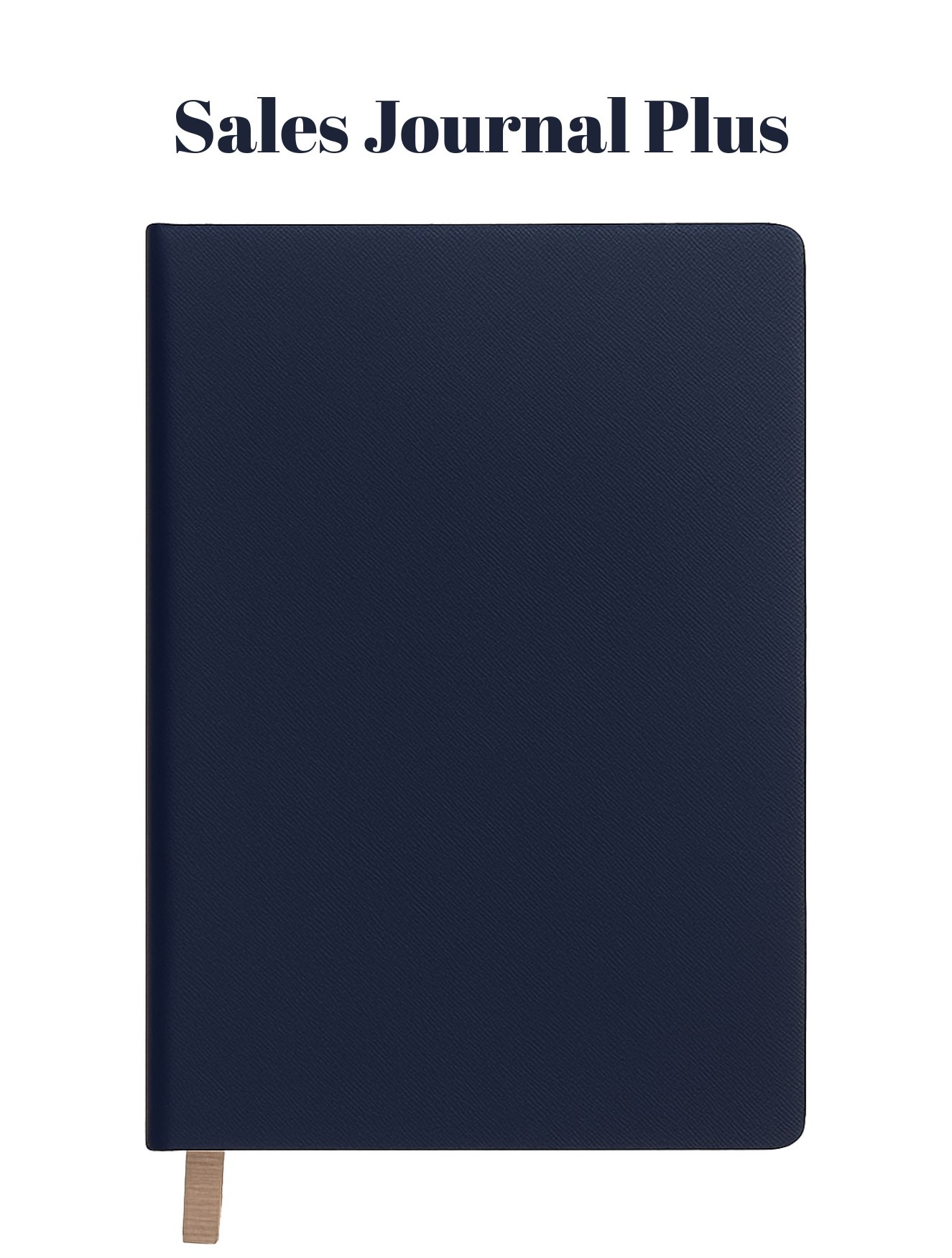 The Sales Journal Plus has a Navy Blue Cover, has an extra page for notes each day, lasts 4 months and measures 8.3" by 5.75".