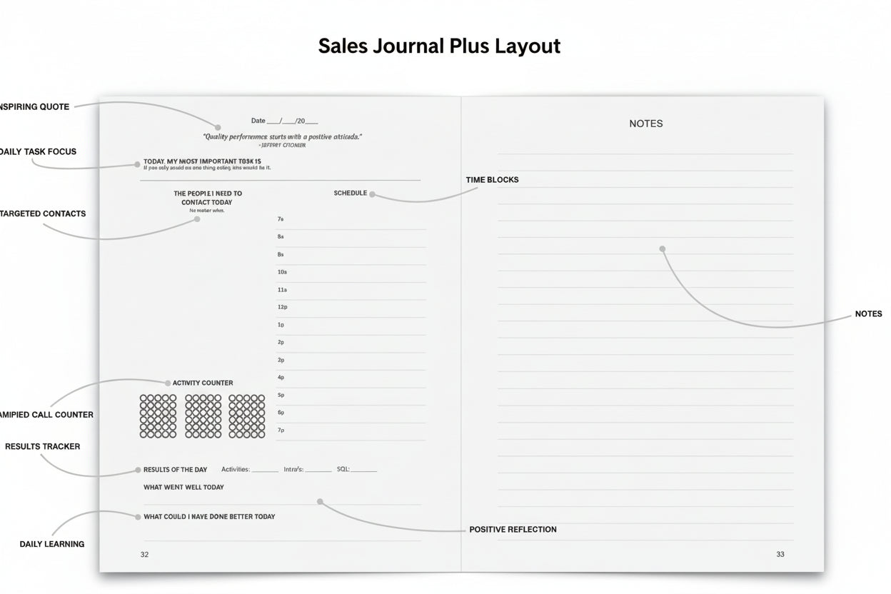 The Sales Journal includes an introduction section to help you get the most out of your experience and space for six months worth of planning (6 days/week) + additional pages for your weekly review and extra notes.